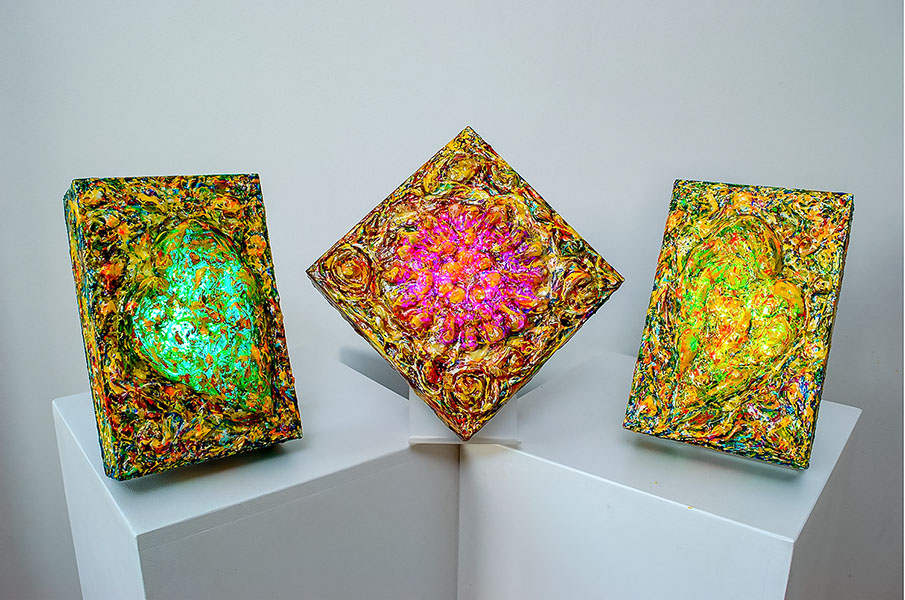 Acrylic painting, metallic and interference pigments, technical textiles, crystal objects, fiber objects, aluminum pieces, stainless steel, engineered stone, magnets, epoxy pastes, thermosetting resins, FlexFoam-iT, elastomer polymers.